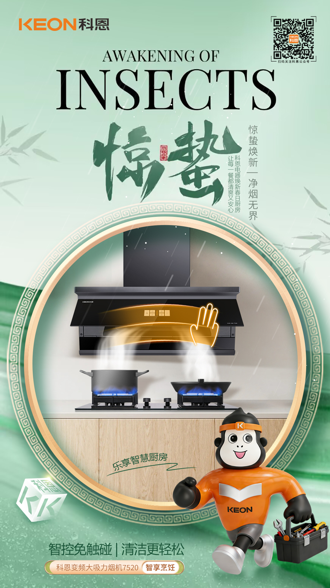 春雷启惊蛰,焕厨正当时,科恩大吸力烟机7520,以巧装破局,以强吸净味,以智能省心,一灶春风,一室清新,让厨房告别油烟困扰,让烹饪回归自在从容。惊蛰焕新,选科恩7520,净享健康无烟,悦启春日美好厨居生活!