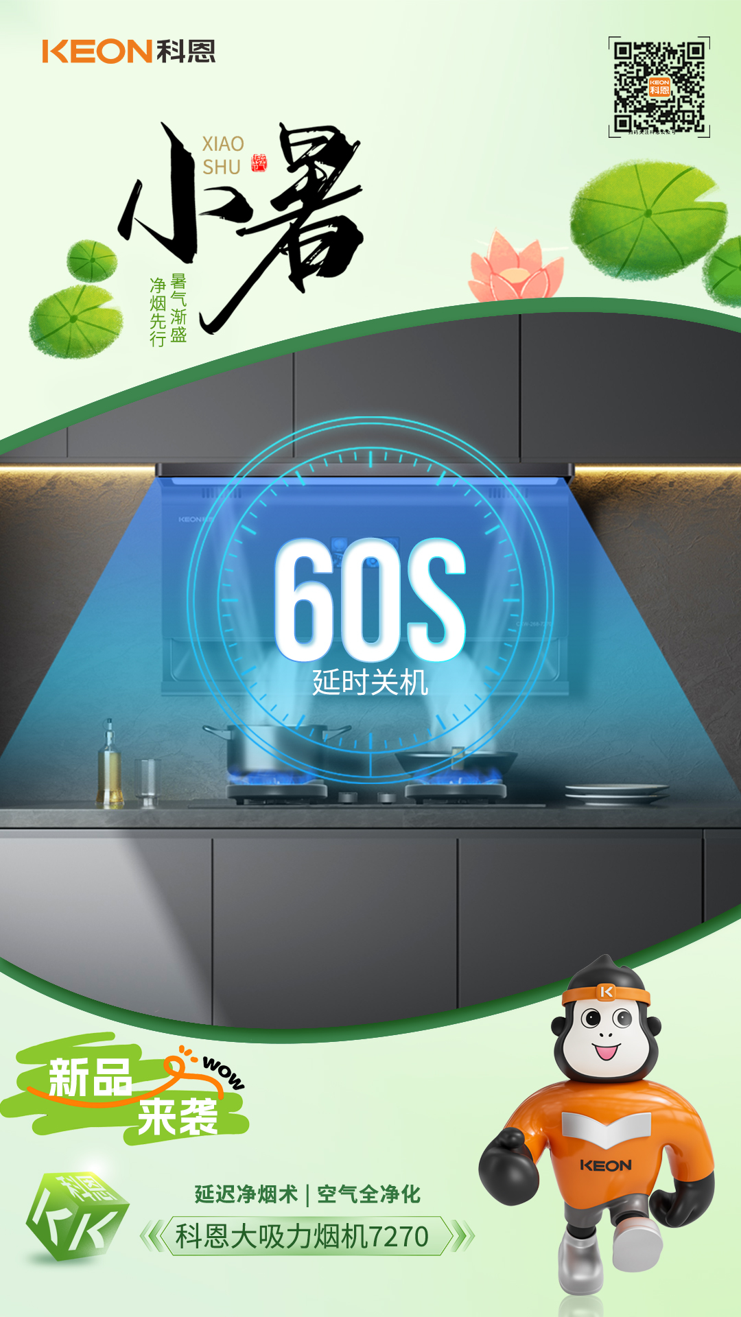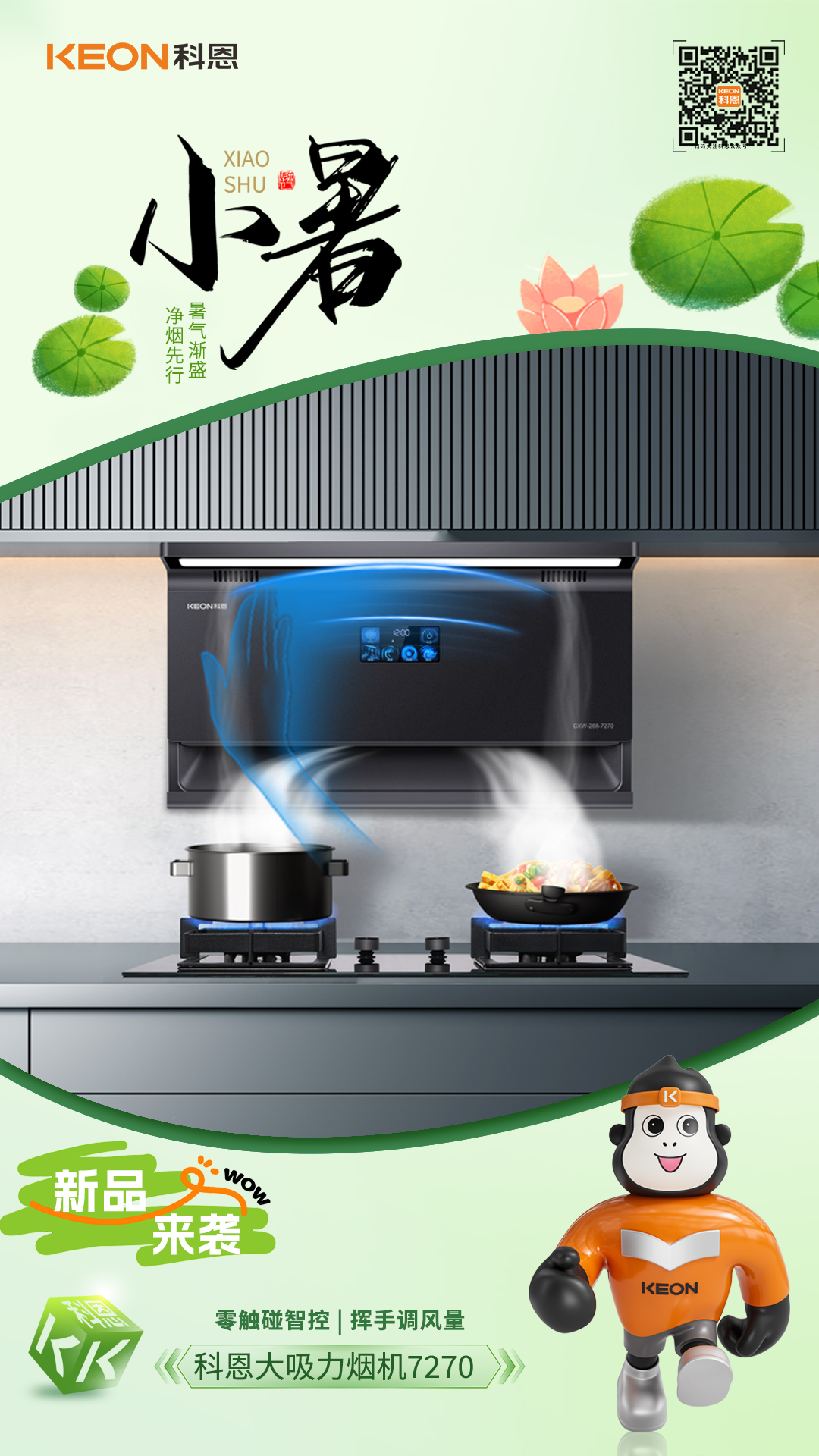 净烟守护,暑夏清凉。从净烟到清洁,从性能到颜值,科恩7270烟机用硬核实力重塑烹饪体验。让爆炒的烟火气,化作生活的诗情画意,让每一次下厨,都成为清凉惬意的慢时光!