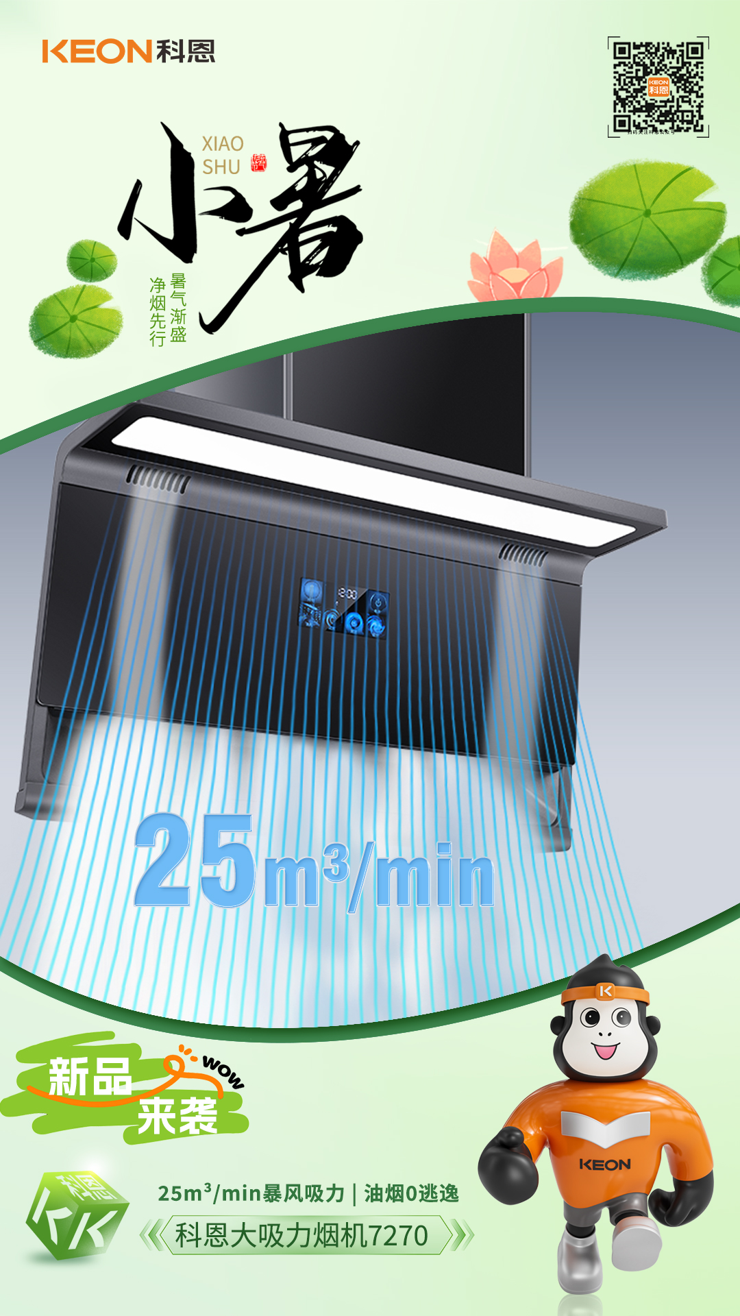 蝉鸣初起,热浪翻涌。小暑时节厨房成高温重灾区,油烟升腾中包裹着暑气更显烦躁,科恩7270烟机携25m³/min暴风吸力来袭,为厨房筑起清凉防线,让净烟快一步,生活慢享受。