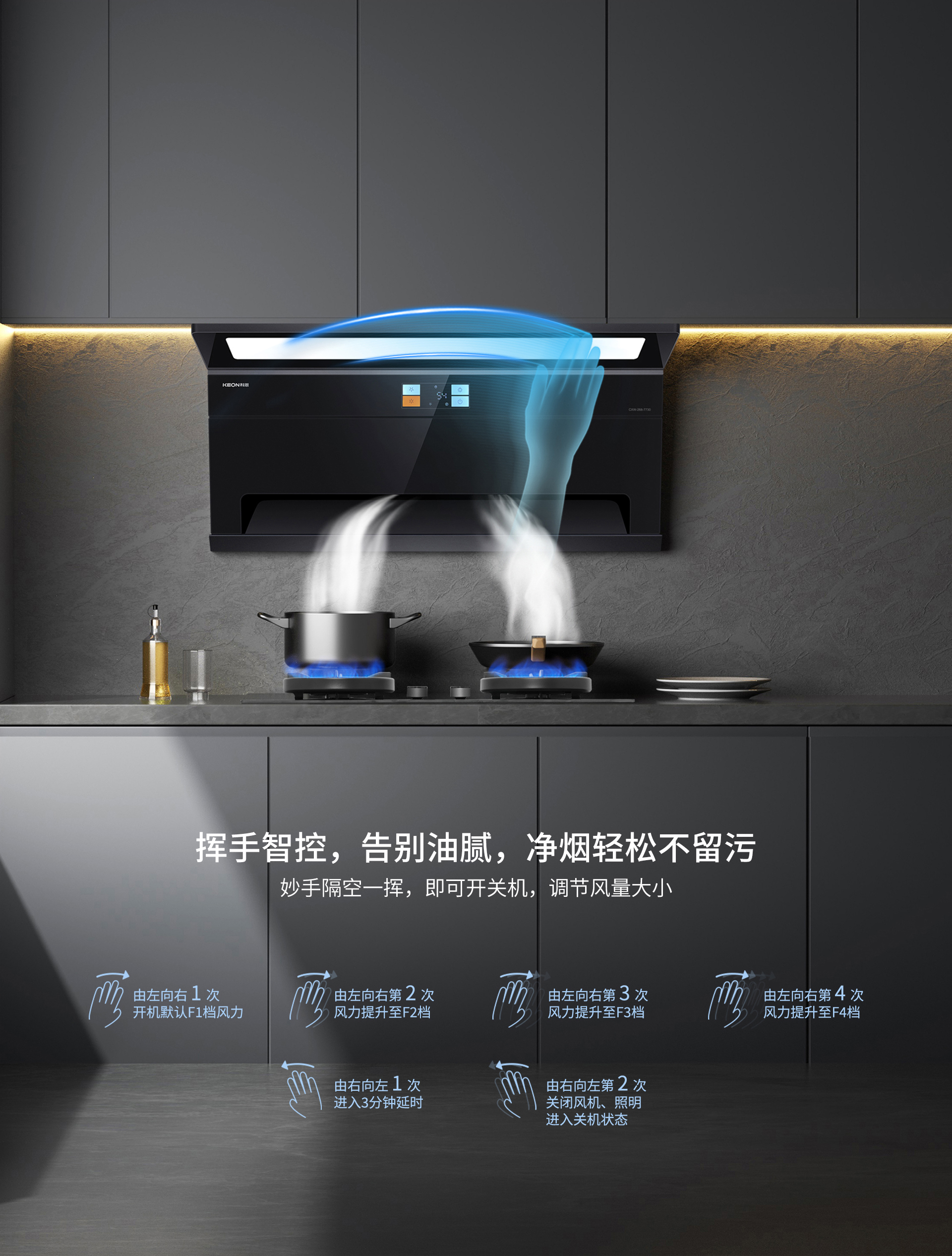 智能操控,告别油腻接触。挥手即能掌控,双手不沾油污,隔空一挥开关机、调风量,模块化彩屏触摸键,老人也能轻松操作,烟灶联动,火起烟净,打造智能便捷的厨居生活。