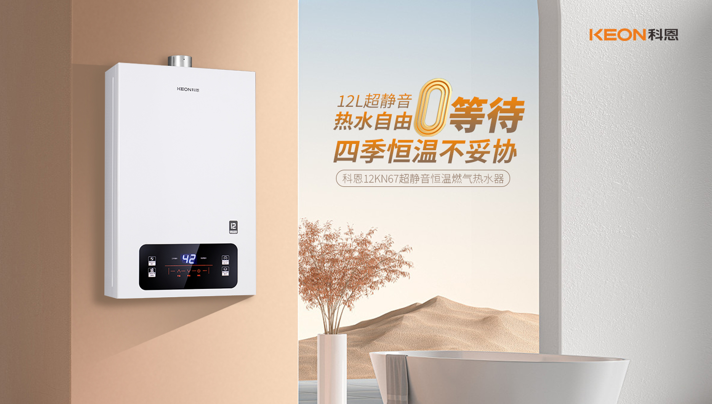 静享恒温,热水无忧。12L超静音运行,沐浴无扰,科恩12KN67燃气热水器,舒适升级。全季水温恒定,0等待畅洗,智能恒温技术,精准控温,科恩12KN67燃气热水器,随心所“浴”。