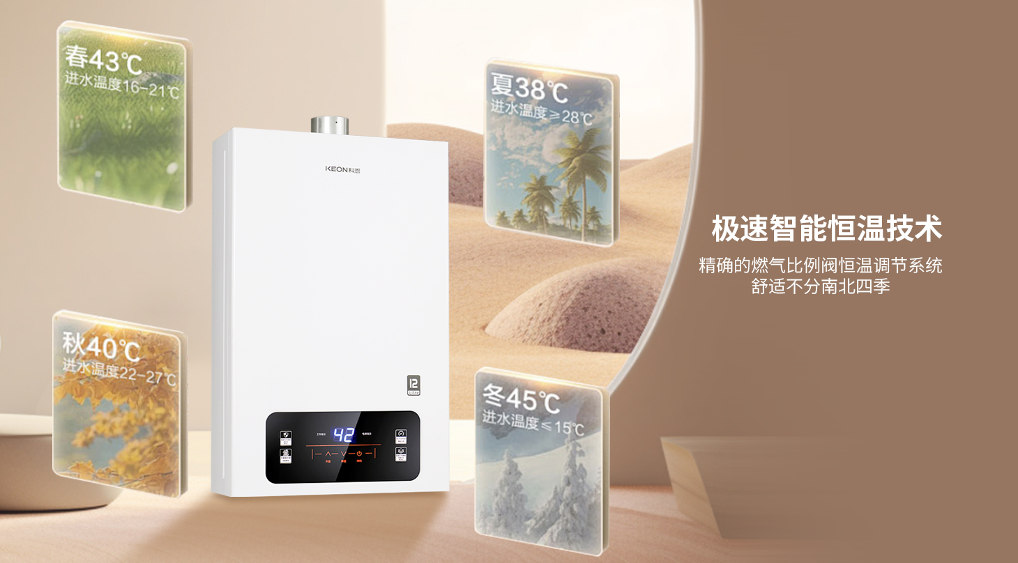 分段燃烧,节能高效。无氧铜水箱加持,热效率高达89%,宽域调温,适配全季,能传感控温,精准无误,科恩12KN67燃气热水器,四季适配。