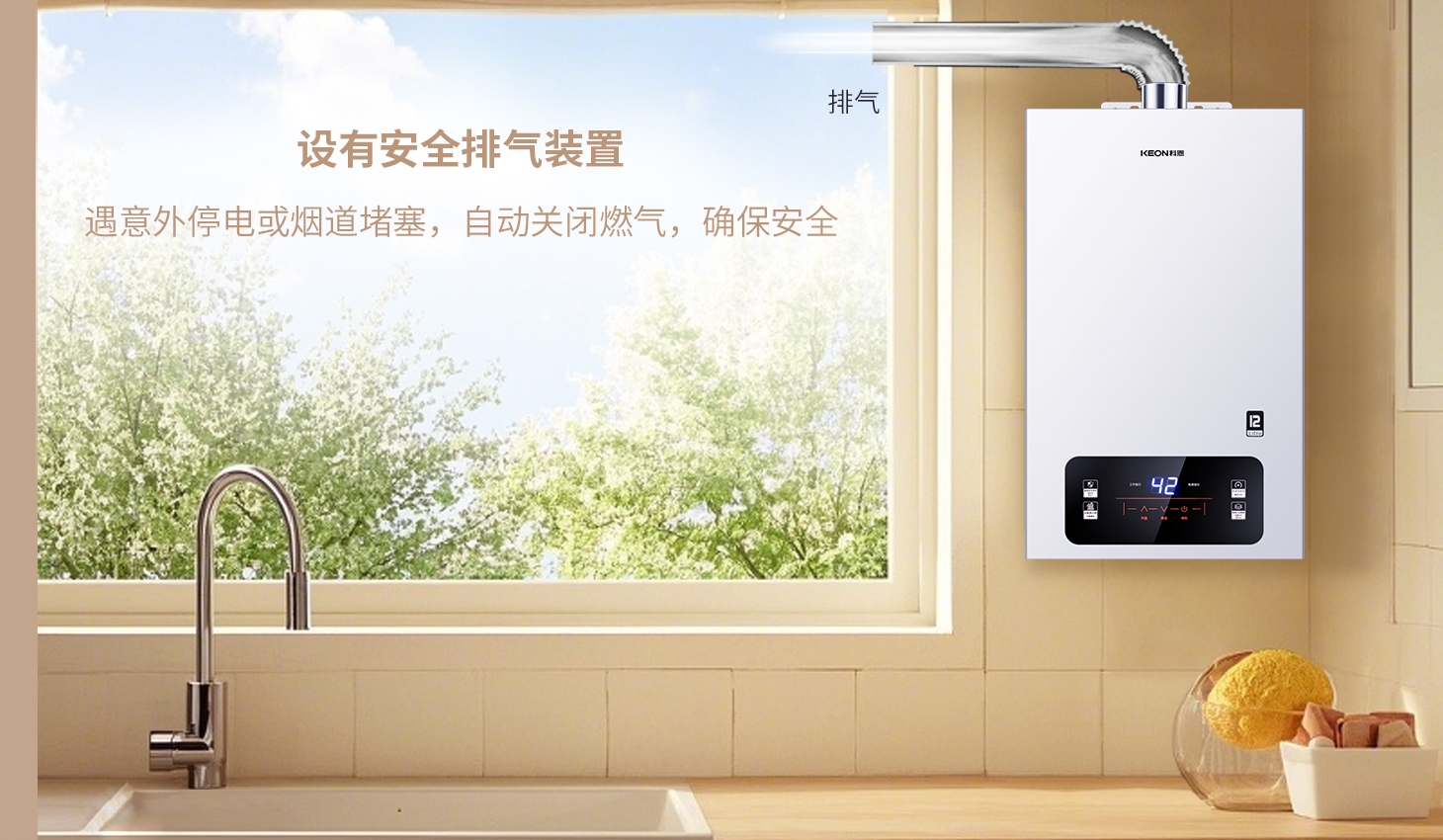 13重防护,安全护航。堡垒式安全设计,隐患清零,停电烟道堵塞自动断燃,防护升级,12KN67燃气热水器,周全守护,定时关机+通风提醒,科恩12KN67燃气热水器,安心沐浴。