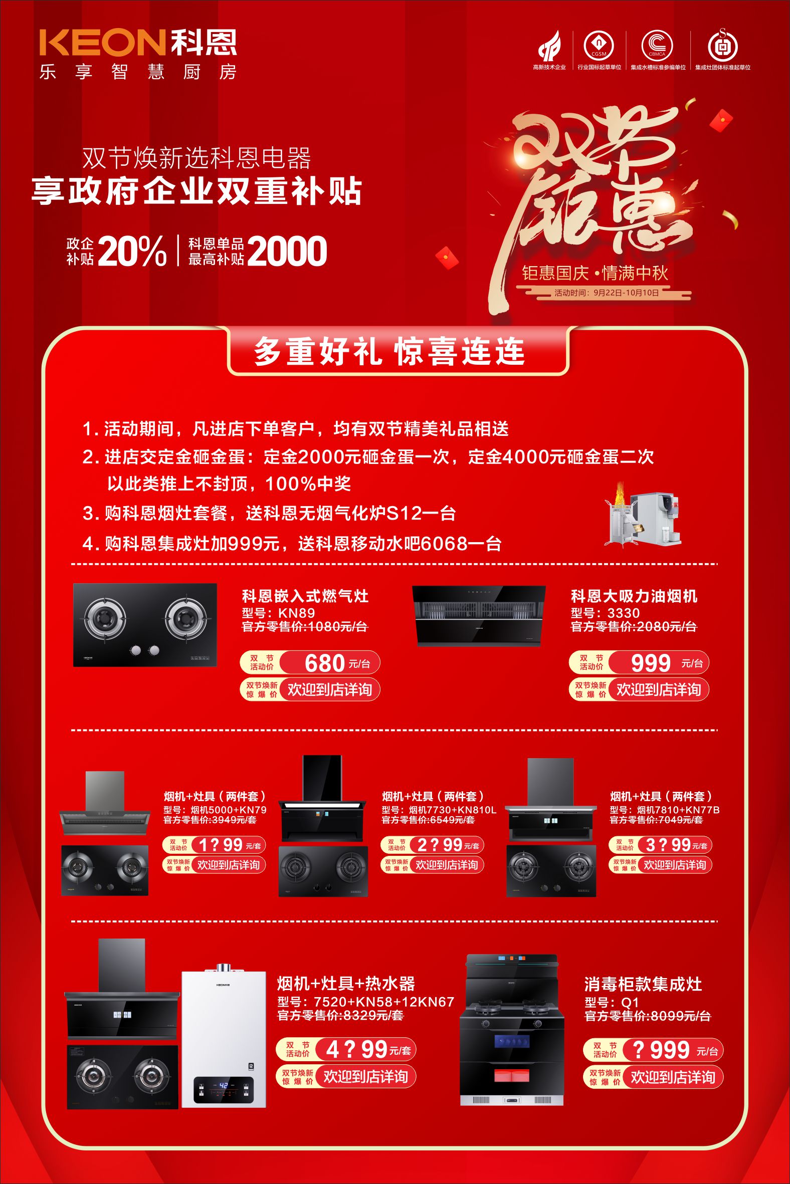 科恩始终以高品质产品和贴心服务,为消费者打造智能、高效的厨房体验。此次双节活动福利丰厚,可享多重礼遇!想给厨房焕新,想让家宴更出彩,想把实用好礼带回家的朋友们,赶紧抓住这难得的机会,前往科恩厨电门店参与活动。让科恩厨电陪你度过一个欢乐、温馨的双节,开启高品质厨房生活新篇章!