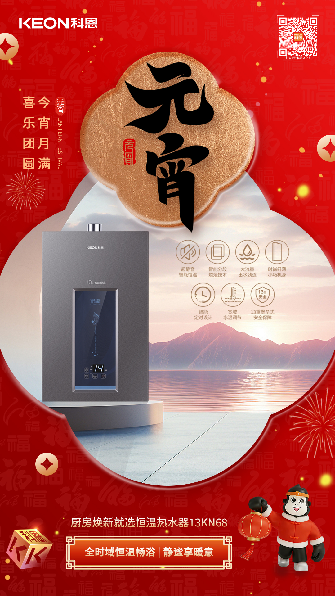 元宵餐后洗漱,怎能少了恒温热水?科恩13KN68以13L大容量满足全家需求,宽域调温,无论是洗手洁面还是舒适沐浴,都能精准控温。智能分段燃烧技术搭配无氧铜水箱,热效率高达89%,节能又高效。